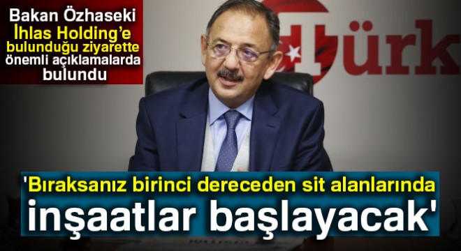 Çevre ve Şehircilik Bakanı Mehmet Özhaseki, İhlas Holding’e ziyarette bulundu. Bakan Özhaseki, Türkiye Gazetesi’nin gündem toplantısına da katılarak önemli açıklamalarda bulundu. Özhaseki, birinci derecede sit alanlarında yapılar yükselmesi için bakanlığa bir çok başvuru geldiğini belirterek, “Şu anda bıraksanız birinci dereceden sit alanlarında inşaatlar başlayacak. Müraacatlar hep o yönde ilerliyor. Milyonlarca metre kareyi heba edecekler. Bıraksanız koyların içerisinde o güzelim koylarda devasal yapılar çıkacak” dedi.