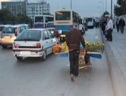 Dolmuşların müşteri kapma telaşı için yoğunlaştığı sağ şeridin seyyar meyve satıcısı tarafından kapatılması nedeniyle yoğunluk orta şeritlere kaydı. Sürücülerin korna çalarak tepki gösterdiği seyyar satıcı, kimseye aldırış etmeden yolda gitmeye devam etti.