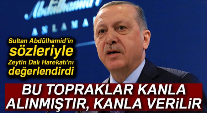 Cumhurbaşkanı Recep Tayyip Erdoğan, Sultan Abdülhamid’in "Bu topraklar kanla alınmıştır, kanla verilir’ sözlerini hatırlatarak, "Değerli arkadaşlar şu anda biz Afrin’de bunun için varız. Öyle sıradan bu iş rastgele bir olay değil" dedi.