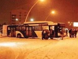 ANKARA’da önceki gün akşam saatlerinde başlayan kar yağışı nedeniyle karla kaplanan yolda kontrolden çıkan EGO otobüsü, Dikmen Caddesi üzerinde kayarak, mahsur kalan başka bir araca çarptı. Orta refüj ve kaldırım arasına sıkışan belediye otobüsü az kalsın çarptığı aracın üzerine devrilecekti. Korku dolu gözlerle kaza anına şahit olan vatandaşlar, kapıların açılması ile birlikte otobüsten aşağıya atladı.