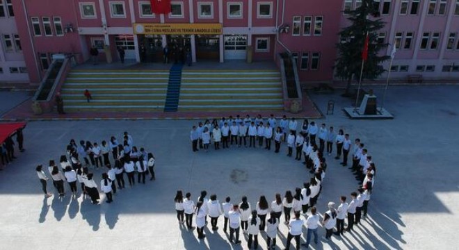 Ankara’nın Kızılcahamam ilçesinde İbn-i Sina Mesleki ve Teknik Anadolu Lisesi öğrencileri, ‘Bahar Kalkanı’ harekâtına destek olmak için okul bahçesinde ay-yıldız figürü oluşturdu. Havadan görüntülenen o ana, Türk bayrağı da eşlik etti.