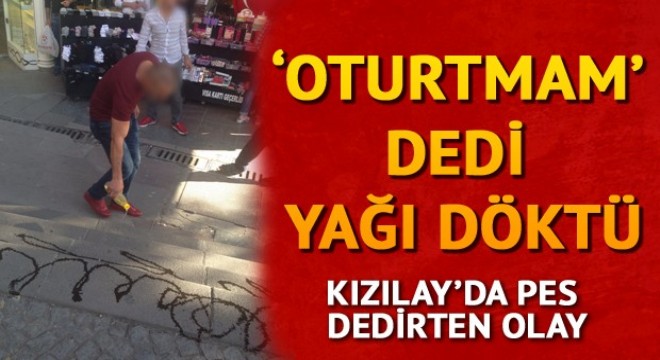Kızılay’da, 19 Eylül Pazartesi günü yaşanan olay “pes” dedirtti. İddiaya göre Yüksel Caddesi girişindeki Kuyumcular Çarşısı önünde tekerlekli tezgâhlarda makyaj malzemesi ve çorap gibi ürünler satan işportacılar, ‘tezgâhların önünü kapattıkları’ gerekçesiyle basamaklarda oturan bir grup genci kaldırmak istedi. Gençlerin itirazları üzerine ilginç bir yönteme başvuran bir işportacı, basamaklara ayçiçek yağı dökerek, vatandaşların oturmalarını engellemeye çalıştı. Ekşi Sözlük’te bir kullanıcının, “19 Eylül 2016 Kızılay yağ rezaleti” başlığıyla paylaştığı olaya, tepki yağdı. İzmir’denAnkara’ya 2 günlüğüne geldiğini belirten olayın mağduru gençlerden biri, yaşananları sosyal medyada şöyle paylaştı: