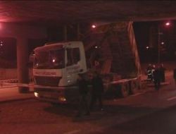 Ankara'da, havası boşalan damperin kalkması sebebiyle bir kamyon köprüye takıldı. Ne olduğunu anlayamayan ve hafif şekilde yaralanan kamyon şoförü şoka girdi.