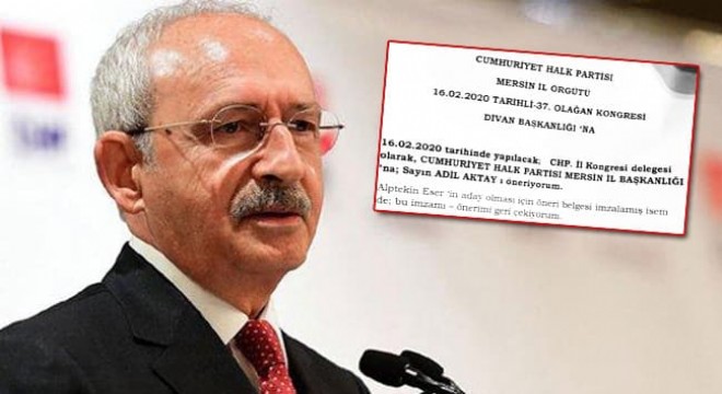 Özkoç, Eser’e imza veren delegelere önceden matbu olarak hazırlanan ve üzerinde “16.02.2020 tarihinde yapılacak CHP il kongresi delegesi olarak CHP Mersin İl Başkanlığı’na Sayın Adil Akay’ı öneriyorum. Alptekin Eser’in aday olması için öneri belgesi imzalamış isem de; bu önerimi-imzamı geri çekiyorum. CHP Mersin İl Başkanlığı’na Sayın Adil Akay’ı öneriyorum. Bu beyan son beyanımdır” yazan dilekçeleri dağıtıp imzalamalarını istedi.
