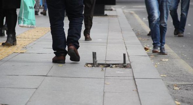 Kızılay Meşrutiyet Caddesi’nde, sokak aydınlatmaları için konulan ancak direk montajları yapılmayan çelik ankraj çubuklar, kaldırımdan yürüyen yayalara zor anlar yaşatıyor.
