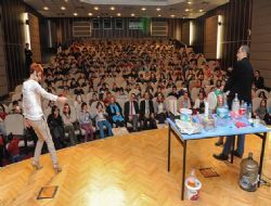 Yunus Emre Kültür Merkezi’nde gerçekleştirilen etkinlikte ses ve titreşim arasındaki ilişkinin anlatılması amacıyla sadece ip kullanılarak çeşitli hayvan seslerinin çıkarıldığı gösteri ile pet şişe, kolonya ve kibrit kullanılarak yapılan roket miniklerin büyük beğenisini kazandı.