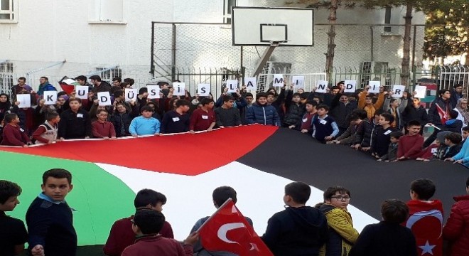 Ankara Yenimahalle’de özel bir okulun öğrencileri okul bahçesine dev Filistin bayrağı açarak Amerika’nın Kudüs kararını protesto etti.