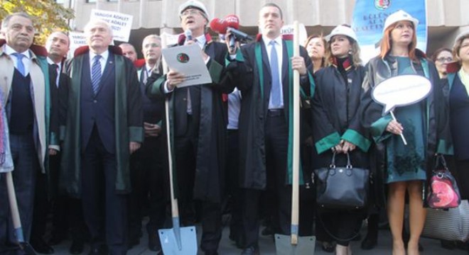 Sıhhiye’deki Ankara Adliyesi’nin önüne küreklerle gelen Ankara Barosu’na kayıtlı avukatlar, parçalı haldeki mahkemelerin tek bir çatı altında toplanmasını isteyerek, temsili temel attı.