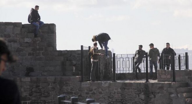 Tarihi Ankara Kalesi’ndeki düşme tehlikesini önlemek amacıyla monte edilen korkuluklar ile uyarıları hiçe sayan bazı ziyaretçiler, korkuluk demirlerinin ve surların üzerine tırmanarak ziyarete kapalı kısma geçiyor.